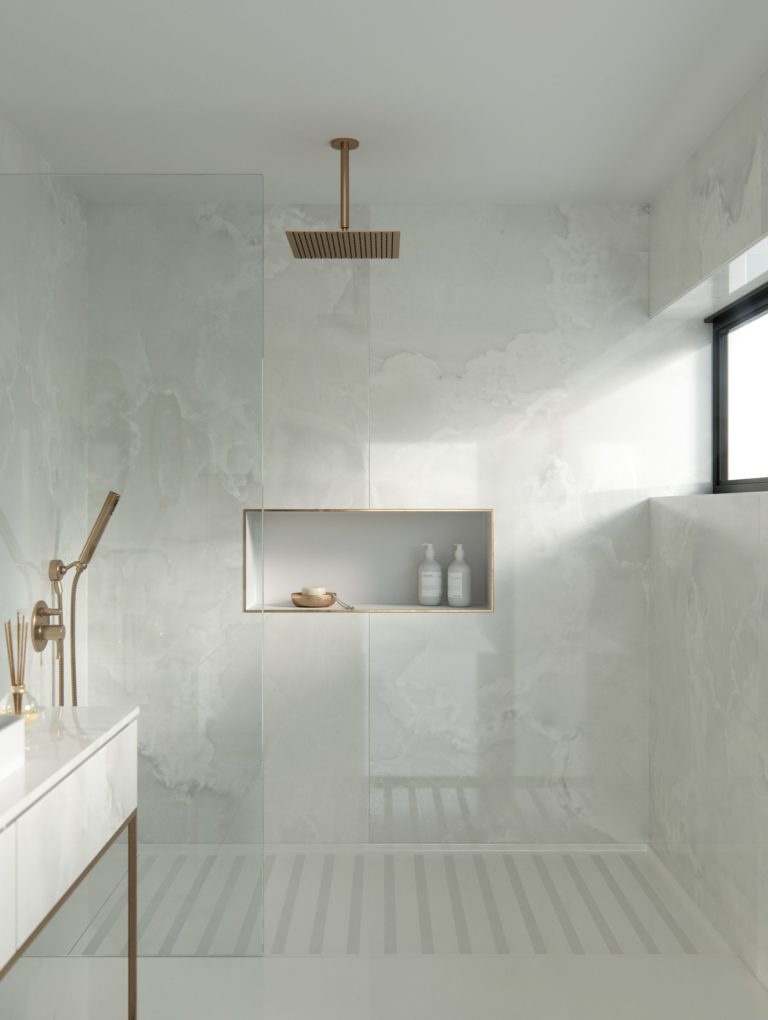 Passgenaue Wandpaneele für fugenlose luxuriöse Duschen und atemberaubende Bäder aus einem Stück. Aus demselben Material gefertigte, und ebenfalls passgenaue Designelemente, wie z.B. ebenerdige Duschtassen, rutschsichere Bodenbeläge, usw.